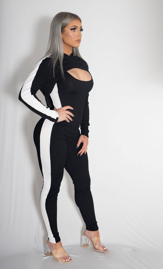 WHITE SIDE STRIPE JUMPSUIT WITH PULLOVER HOODIE SET